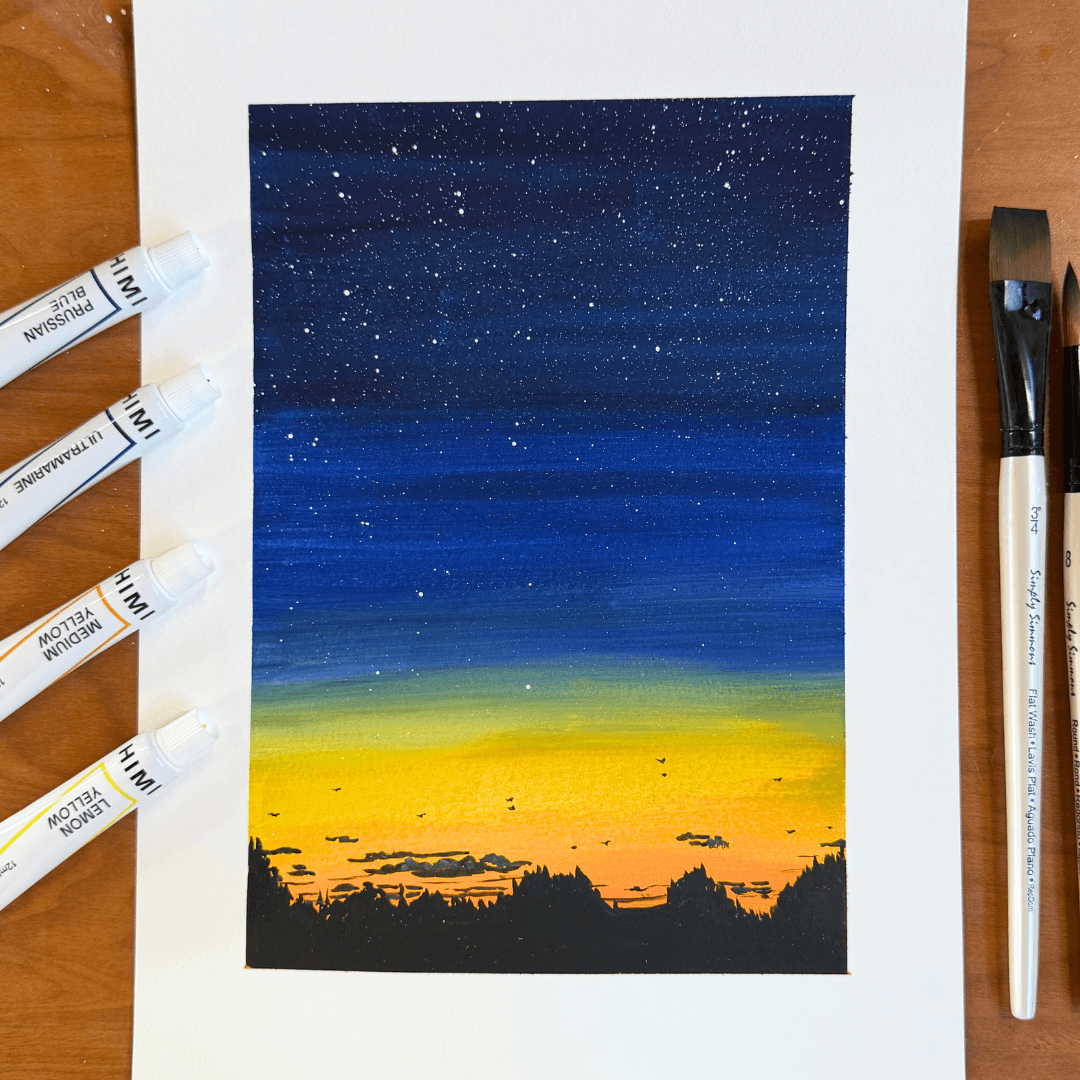 Gouache is as versatile a medium as watercolors, acrylics, and oils. In this course, we want to explore using gouache to paint a night landscape. Students will learn how to smoothly blend gouache to create gradients – a technique commonly used for painting landscapes and skies. You will also learn the proper way to layer gouache paint without bothering the colors you want to keep as is. We will learn these techniques each week and while working on a final landscape painting.